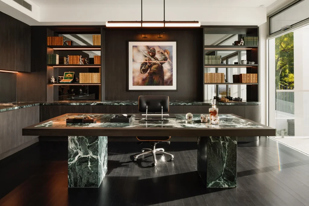 From timber veneer desks and stone worktops to concealed storage cabinetry and floating shelving, every element is built for long-term durability and visual harmony.