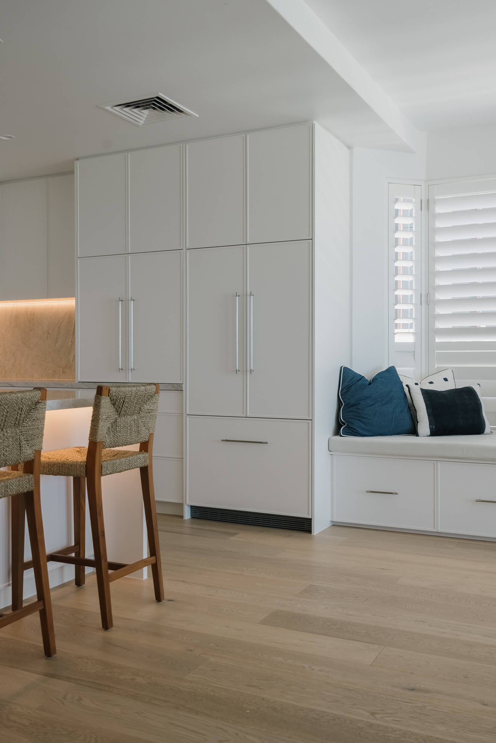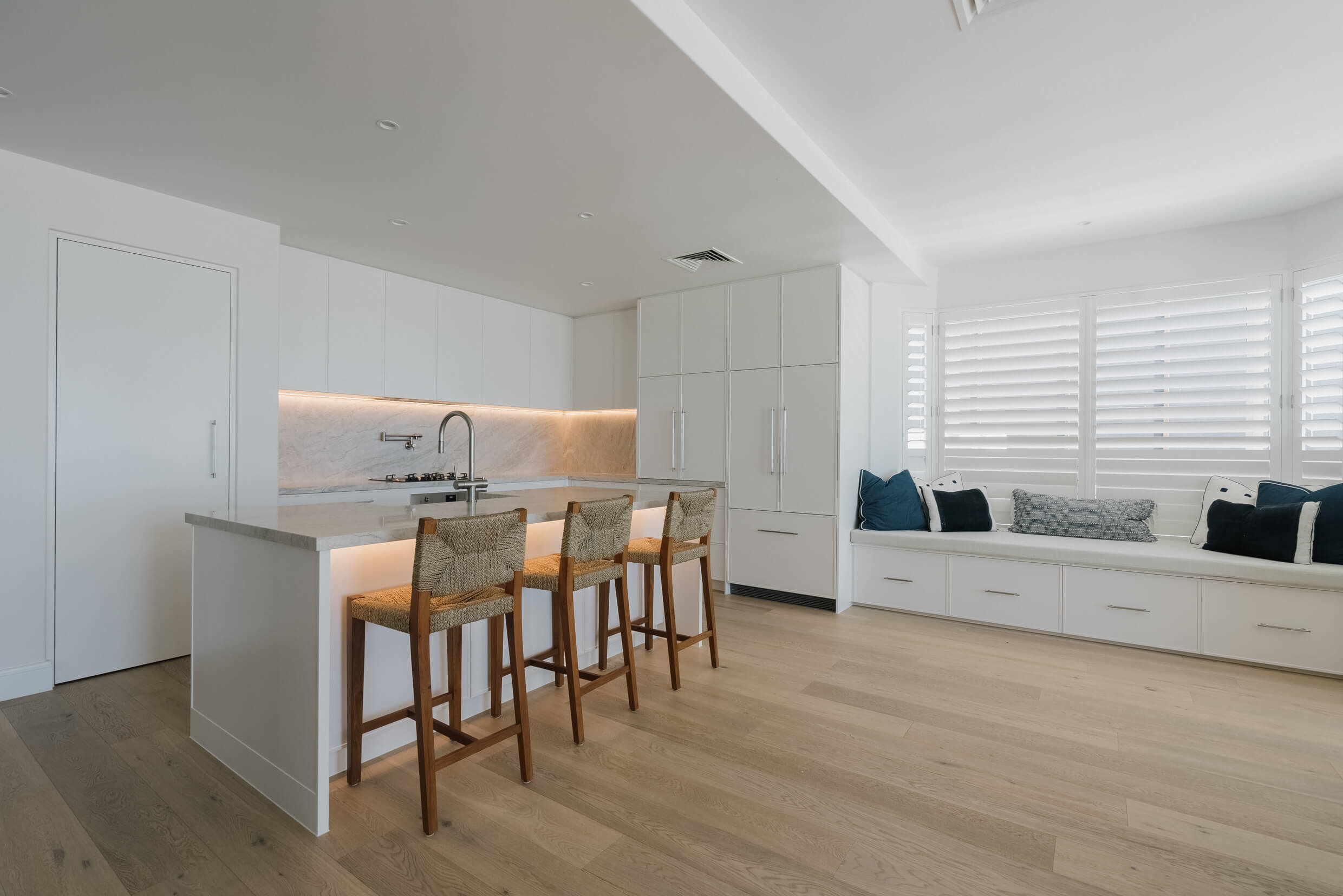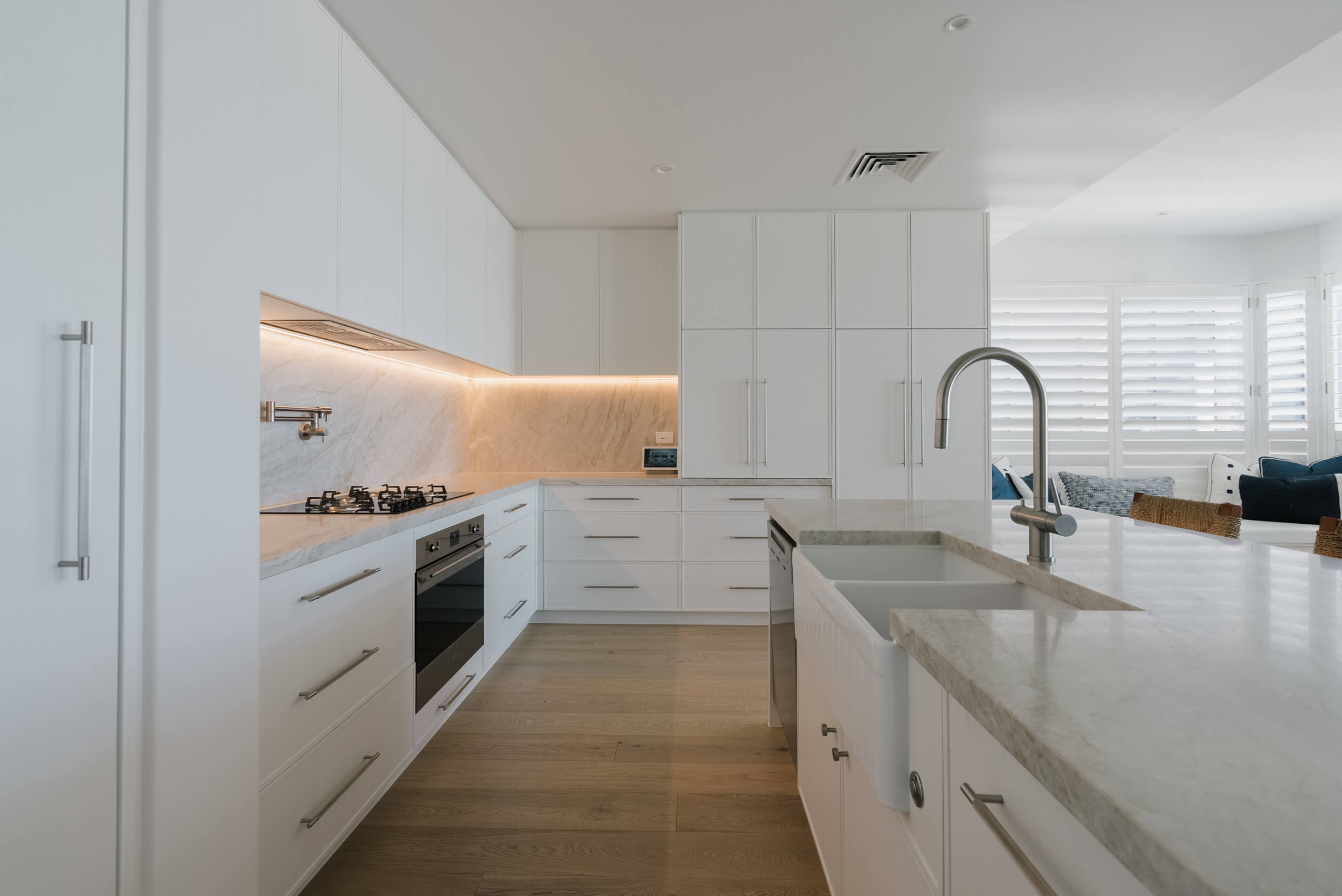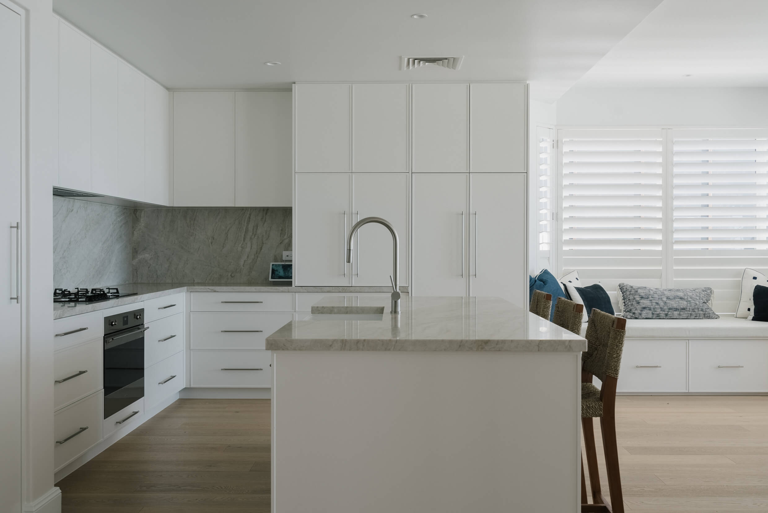 The Mermaid Waters kitchen is a timeless classic, defined by clean lines, balanced proportions and understated elegance. A warm, creamy benchtop and splashback, softly veined in delicate gold and beige tones, complement the design. Together, these elements create a serene, inviting palette that blends timeless simplicity with subtle, refined luxury.