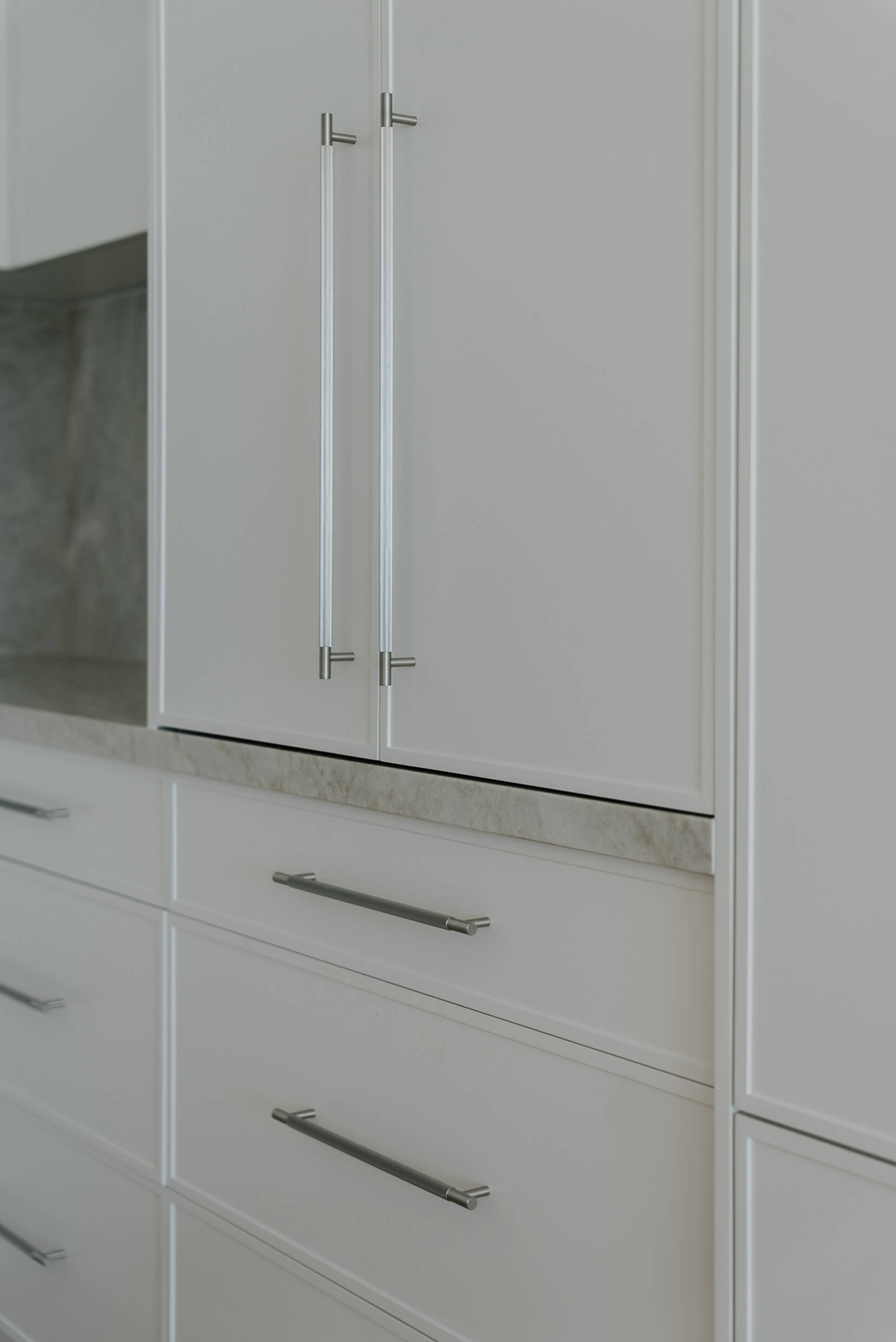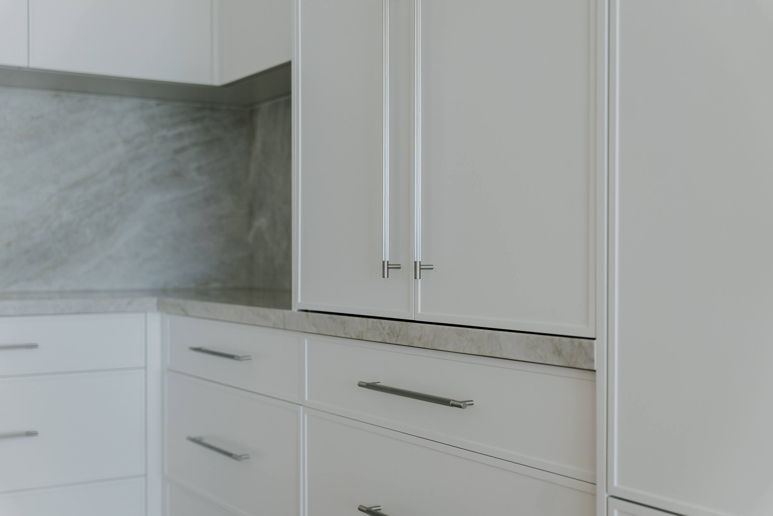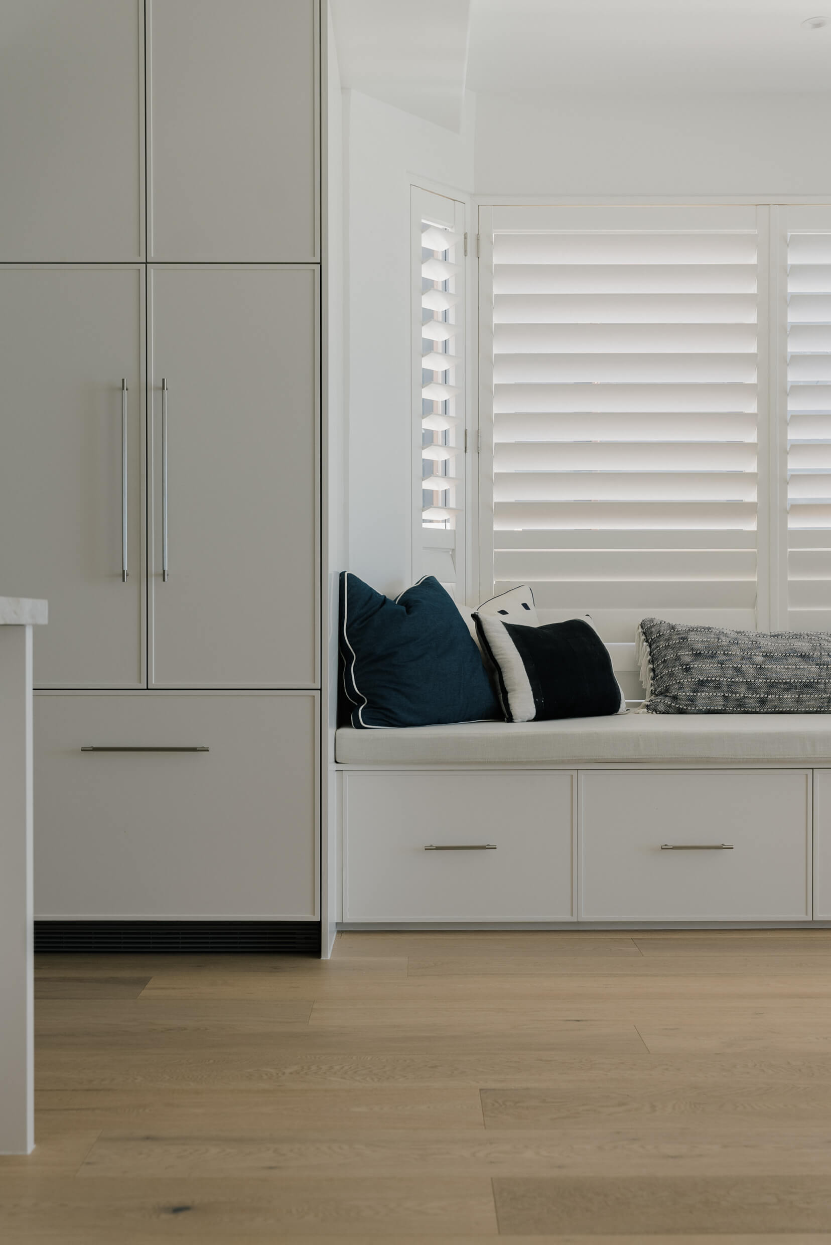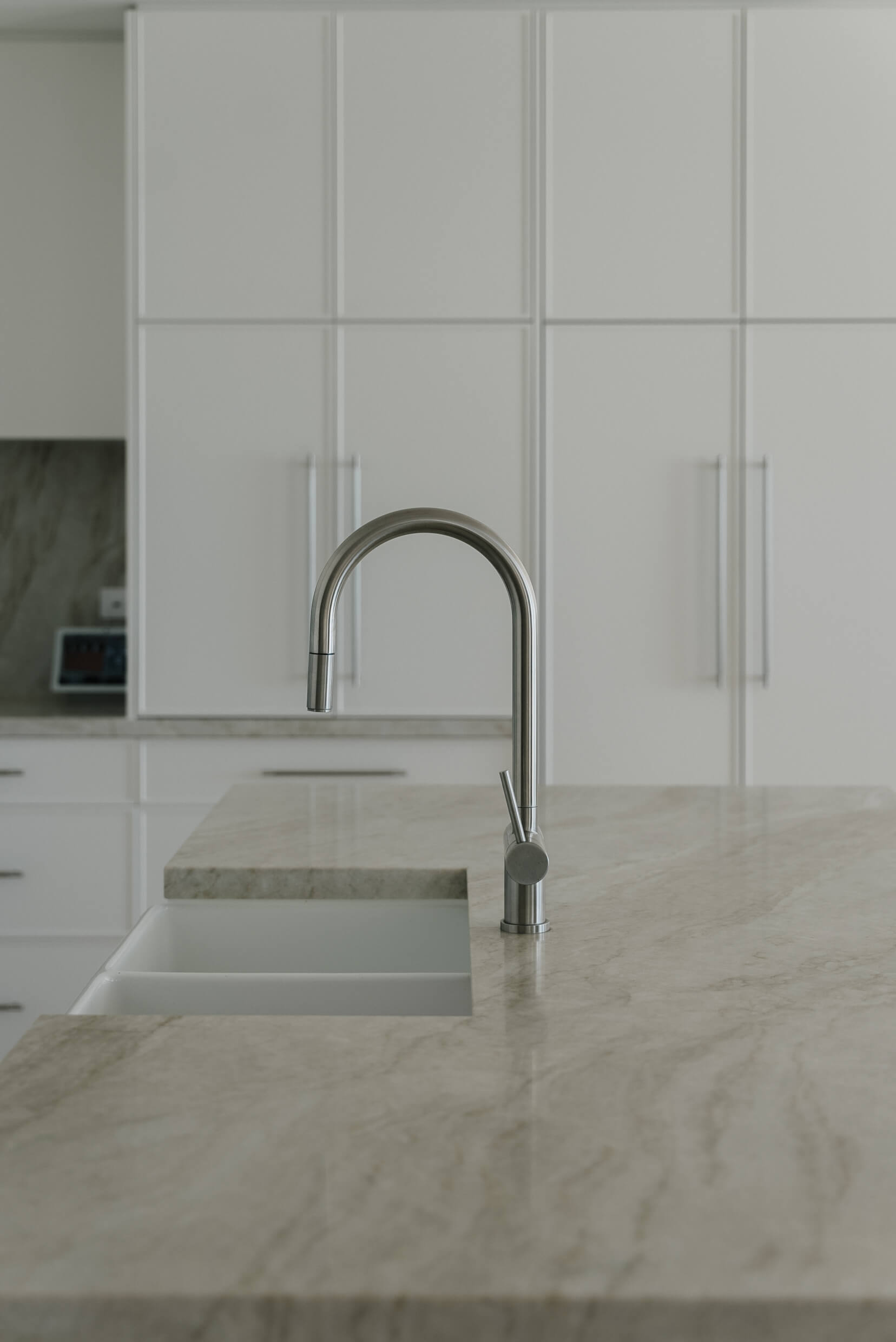 The Mermaid Waters kitchen is a timeless classic, defined by clean lines, balanced proportions and understated elegance. A warm, creamy benchtop and splashback, softly veined in delicate gold and beige tones, complement the design. Together, these elements create a serene, inviting palette that blends timeless simplicity with subtle, refined luxury.