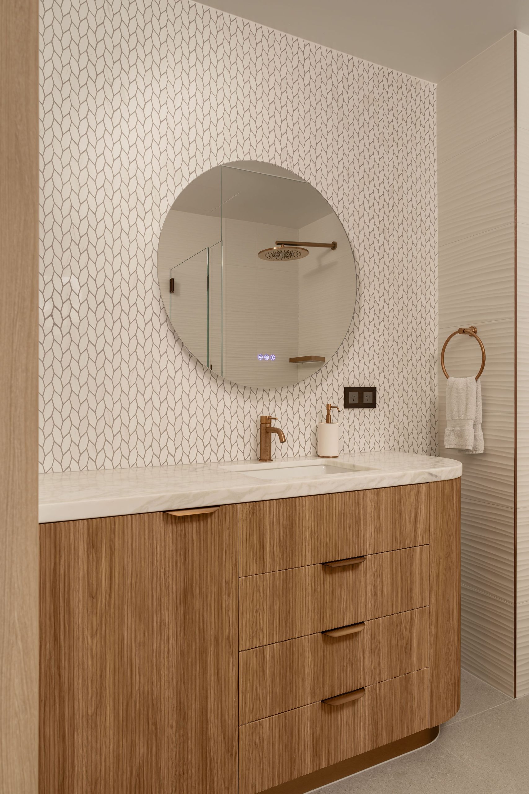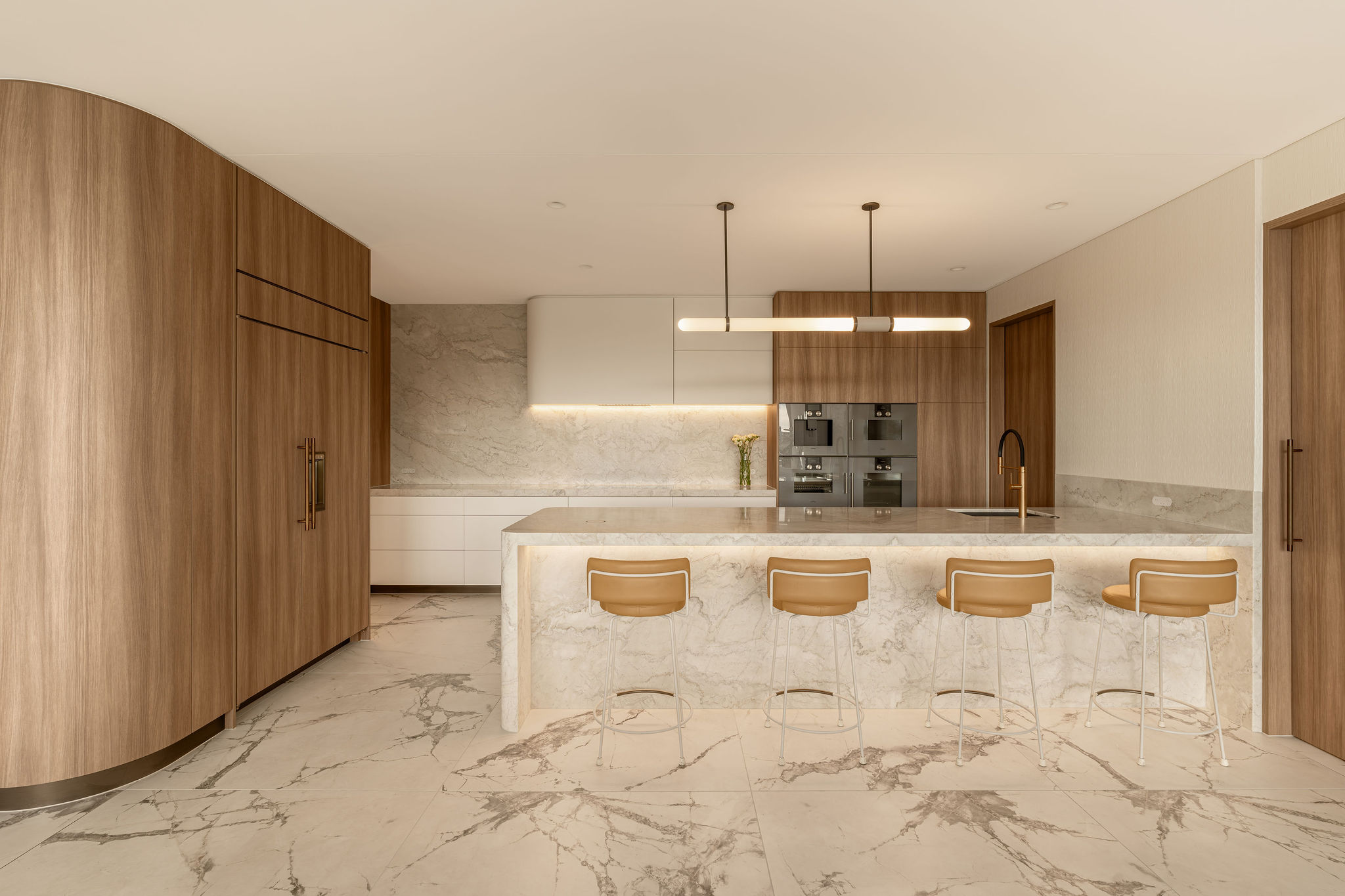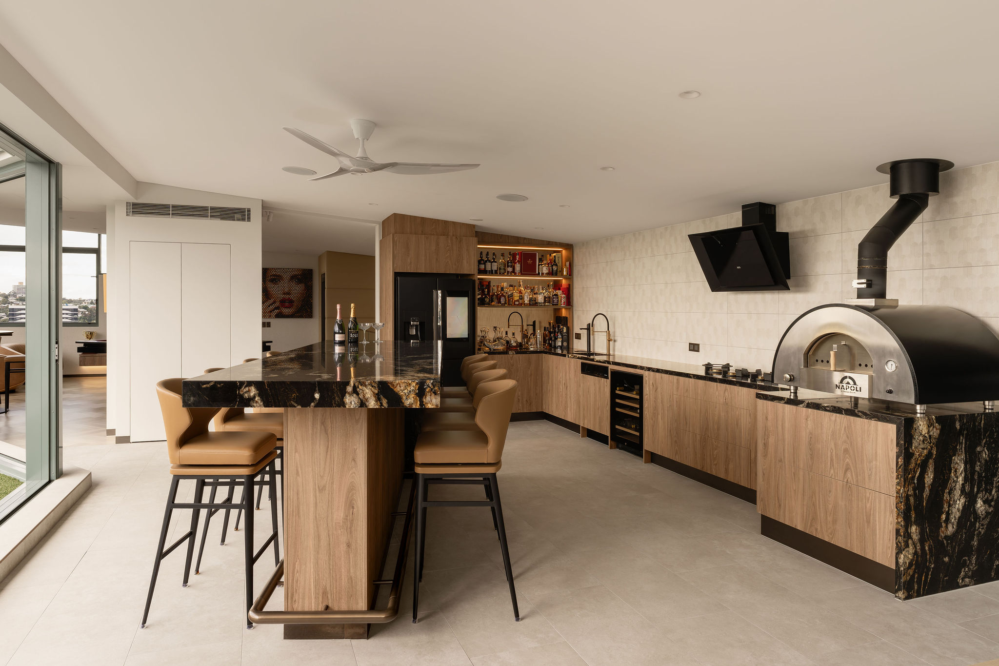 The Toowong kitchen exemplifies refined, design-led contemporary living. Woodmatt cabinetry brings warmth and texture, softening the space while maintaining a sleek, cohesive aesthetic. Stone benchtops provide subtle patterning and durability, forming a generous focal point for family and friends to gather. Soft-close drawers and custom cabinetry offer smooth operation and ample storage, preserving clean lines and an open, uncluttered feel. The result is a timeless, functional kitchen, thoughtfully crafted for both everyday living and entertaining.