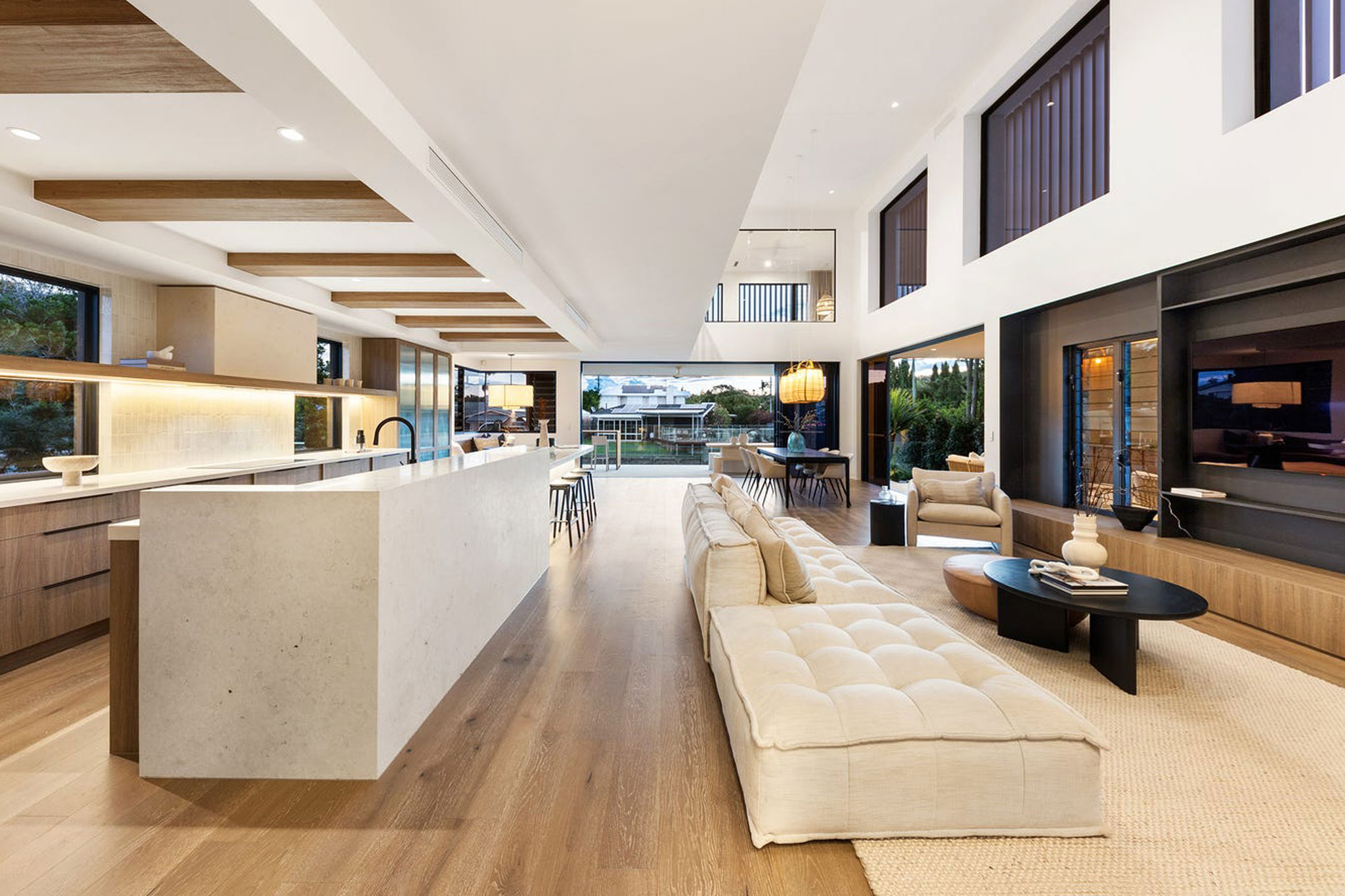The Palm Beach kitchen exemplifies modern open-plan living with warm timber cabinetry and clean lines that balance natural texture and sleek design. A large stone island serves as a striking centerpiece, providing ample workspace and subtle texture. Integrated lighting enhances the airy, light-filled space, while the layout promotes seamless flow between cooking, dining, and living areas. Connected to the outdoors, the kitchen offers a sophisticated yet inviting heart for everyday life and entertaining.